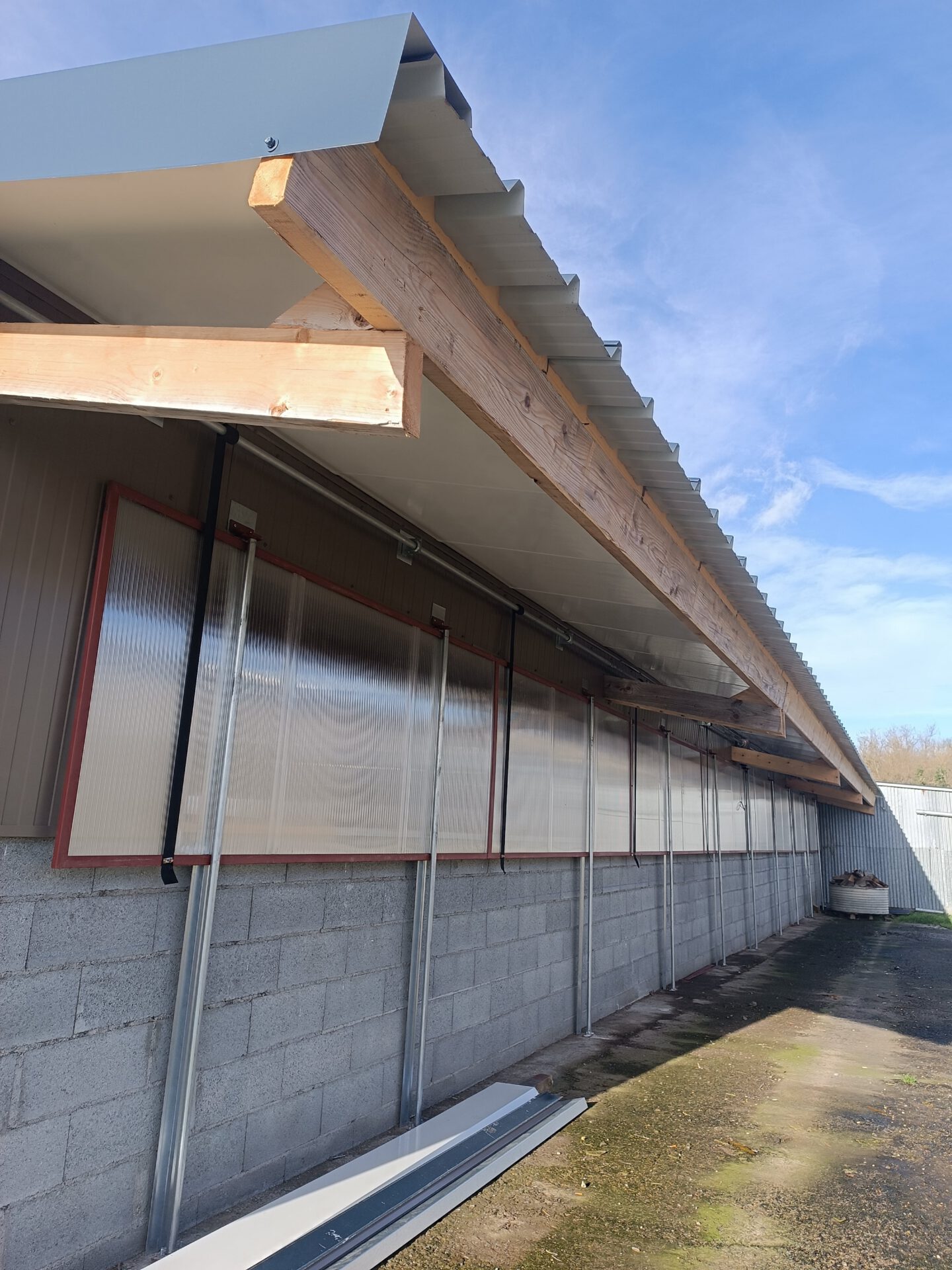 Nous avons donc entrepris une rénovation complète incluant la pose de panneaux sandwich isolants, la création d’un faîtage ventilé et lumineux, l’installation de volets ouvrants et la construction de casquettes pour limiter les remontées d’humidité.